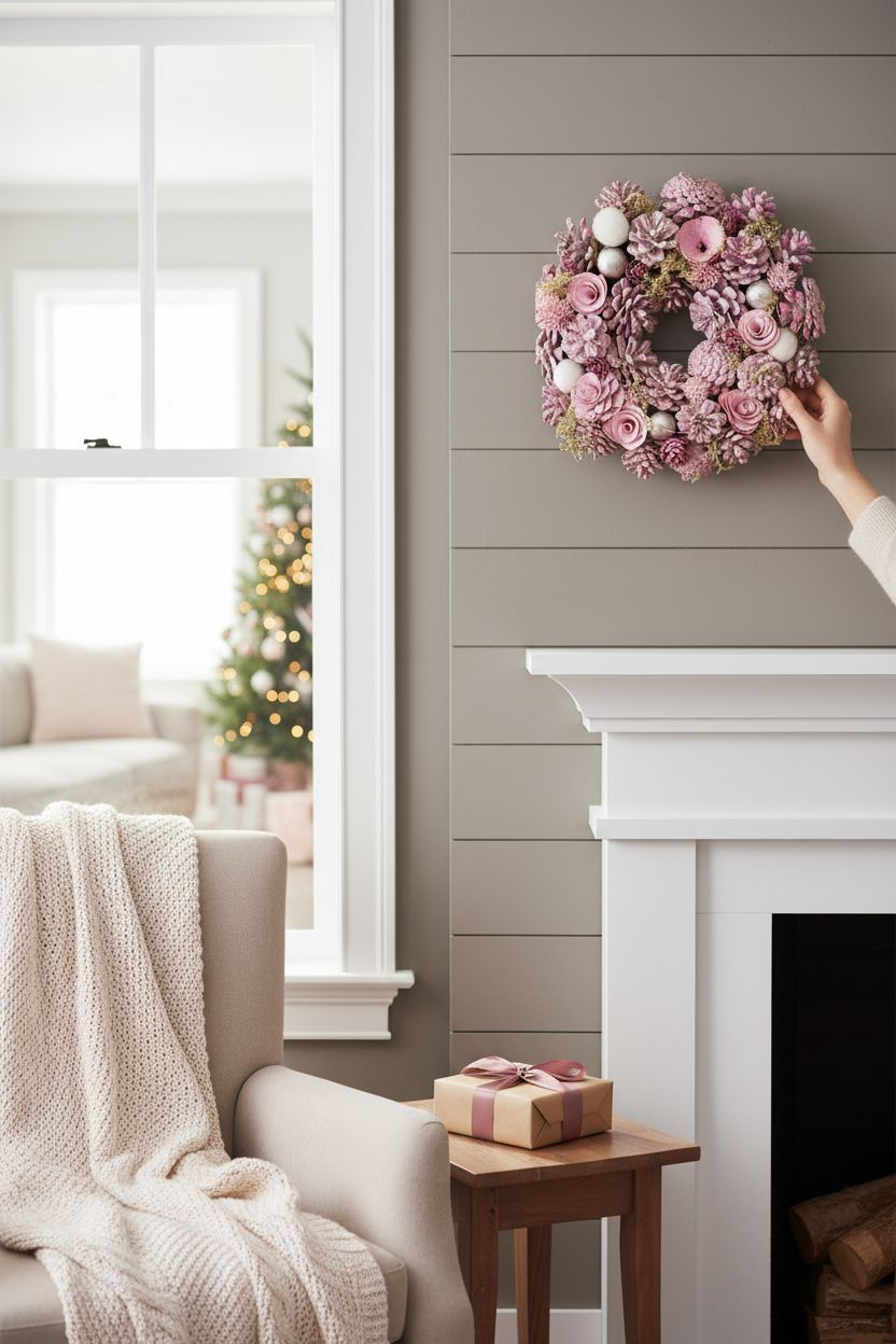 Autumn Decor Collection Pink Holiday Wreath with Roses, Pine Cones, Silver Ornaments, 12 Inch Artificial Christmas Door Wreath for Winter Home Decor Wreath